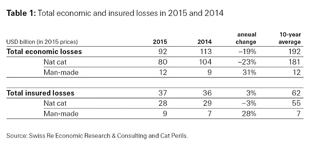 92.000 millones de dólares son las pérdidas totales a causa de todas las catástrofes naturales de 2015. De ellas, según el último informe de Sigma de Swiss Re, únicamente 37.000 millones, es decir el 40,2%, estaban aseguradas -la media de los últimos 10 años fue de 62.000 millones-. Del total de pérdidas aseguradas, 28.000 millones tuvieron su origen en catástrofes naturales, similar que en 2014, teniendo en las explosiones en el puerto de Tianjim, en China, su principal coste con pagos que alcanzaron los 3.000 millones.