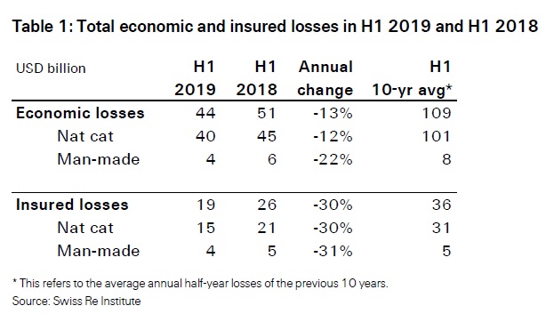 Las pérdidas por catástrofes ascendieron a 44 mil millones de dólares en el primer semestre de 2019. Esto supone un descenso de 7 mil millones respecto a los 51 mil millones de contabilizadas en 2018. De estas pérdidas, 4 mil millones fueron debidos a catástrofes provocadas por la mano del hombre mientras que los restantes 40 mil millones fueron por causas naturales según datos de Swiss Re.