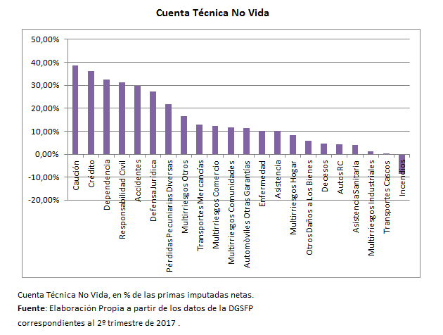 Hay cuatro ramos No Vida que exhiben ratios combinados netos por encima o rozando el 100%, según los datos de la DGSFP correspondientes al segundo trimestre del año. El peor ratio es el de Incendios, con un 113,61%, apreciándose, además, un contundente empeoramiento respecto al 84,64% de hace un año. El ratio combinado de este ramo superó por primera vez el 100% en el primer trimestre de este mismo año, hasta entonces su eficiencia era envidiable, con ratios que han llegado a ser del 63%. Además, en el segundo trimestre del año era el único ramo de No Vida con resultados negativos. El resultado de la Cuenta Técnica No Vida (como porcentaje de las primas imputadas netas) fue del -8,54% frente al 19,31% de hace un año.