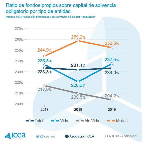 Según los datos de ICEA, en los últimos resultados a diciembre de 2019 sobre la situación financiera y de solvencia del sector asegurador, "se puede apreciar que la ratio de los fondos propios sobre el capital de solvencia obligatorio se ha mantenido entre el 230% y el 235%, alcanzando su mayor valor en el último ejercicio con un 234%". Precisa que en el segmento de entidades mixtas la ratio está por encima de la media mientras que las compañías de no vida tienen una ratio inferior. ICEA ha llevado a cabo un Análisis Estratégico de Posicionamiento en Riesgo y Solvencia, con una muestra de 130 entidades que suponen una cuota del 92,6%.