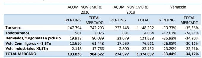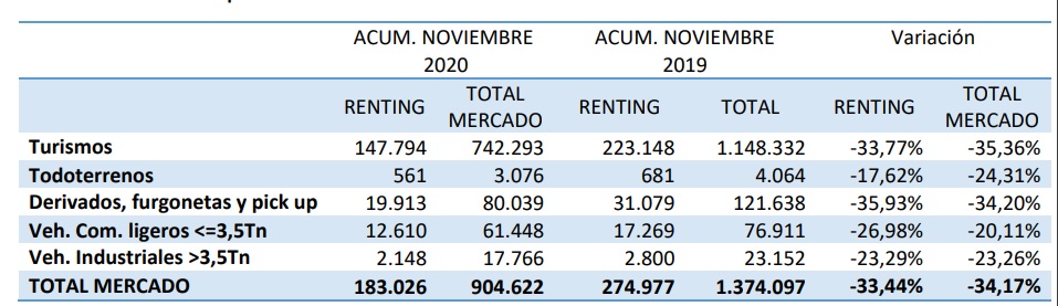 Con todo, las inversiones en compra de vehículos generadas por el sector del renting alcanzan los 3.776 millones de euros en los primeros once meses del año, con una caída del 29,97% sobre el acumulado a noviembre de 2019