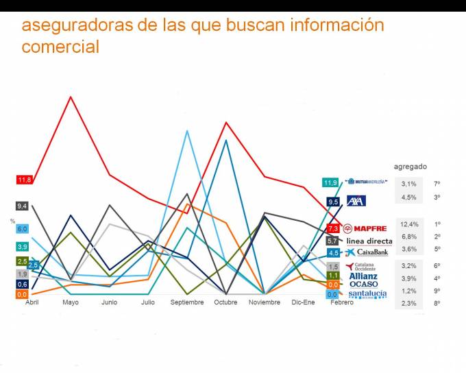 En cuanto a las aseguradoras más buscadas por los particulares la primera es Mapfre (12,4%), seguida de Línea Directa (6,8%9), AXA (4,5%), Allianz (3,9%), CaixaBank (3,6%), Catalana Occidente (3,2%), Mutua Madrileña (3,1%), santalucía (2,3%) y Ocaso (1,2%).