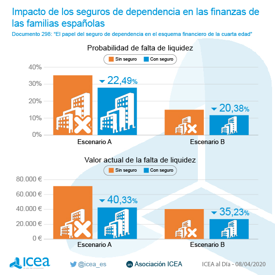 La probabilidad de que una familia sufra falta de liquidez tras la jubilación disminuye si cuentan con seguro de Dependencia. ICEA ha analizado cómo resulta el impacto positivo en las familias por la contratación de seguros privados de Dependencia por parte de las familias españolas cuyo cabeza de familia esté entre 60 y 65 años de edad. Para ello plantea un escenario A, en el que la familia puede acumular más riqueza después de la jubilación, y un escenario B en el que la familia no puede acumular más riqueza después de la jubilación. "Se observa que la probabilidad de que la familia sufra de falta de liquidez tras la jubilación disminuye si se han contratado seguros de dependencia (entre un 20 y un 22% dependiendo del escenario considerado)".