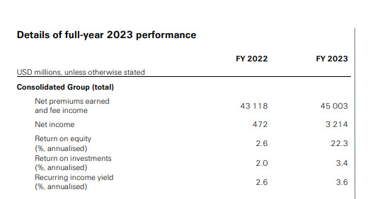 El director ejecutivo del grupo, Christian Mumenthaler, manifestó que 2023 fue un "año exitoso" y resaltó que han logrado "todos nuestros objetivos financieros en un año caracterizado por problemas geopolíticos, turbulencias y continua incertidumbre económica". Resaltó que han mejorado el precio adecuando sus negocios de No Vida que han permitido afrontar las "elevadas pérdidas" por catástrofes naturales. Mientras, Vida y Salud alcanzó un "sólido resultado beneficiándose de una gestión activa de la cartera vigente y de un sólido rendimiento de la inversión".