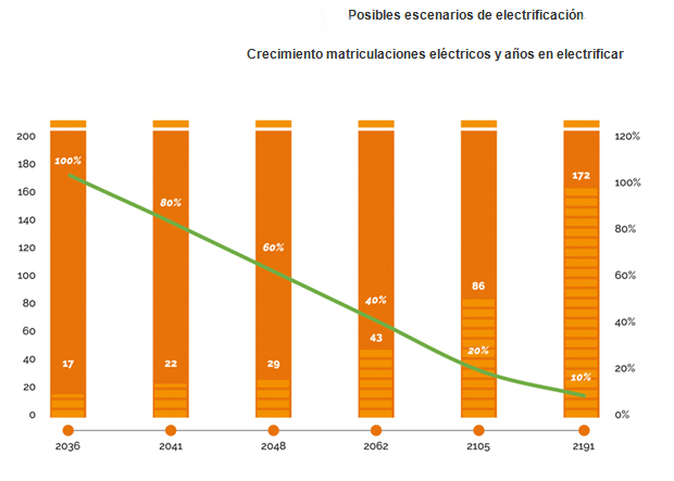 Por otro lado, el informe pone de manifiesto que la electrificación total del parque español en los plazos previstos por la Administración "es más un desiderátum que una realidad pues teniendo en cuenta que de los más de 26 millones de vehículos en circulación apenas el 0,1% son eléctricos". "Así, en una hipótesis en la que el 10% anual de las matriculaciones fueran de eléctricos se tardarían 172 años en lograr electrificar el parque al completo. En otra más idílica, el supuesto que desde este año solo se compraran eléctricos en España, se conseguiría este objetivo para 2036, es decir, cuatro años antes de lo previsto por el Gobierno", añaden.