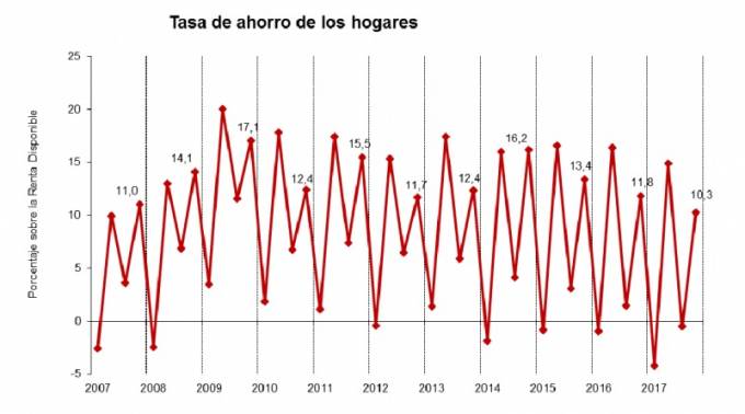 La tasa de ahorro de los hogares españoles cae al 10,3% de su renta disponible según las Cuentas Trimestrales del 4º Trimestre de 2017 publicadas por el INE. Eso supone un 1,5 puntos porcentuales menos que el mismo trimestre del año anterior y es la más baja de los últimos 10 años.