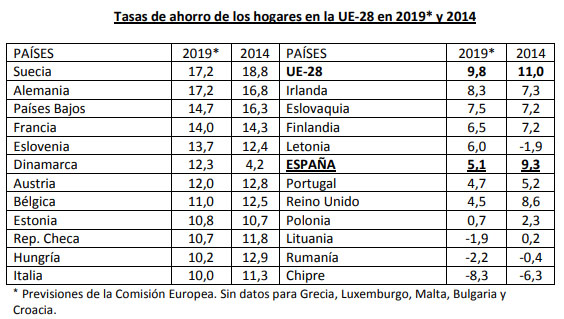 Por el contrario, según el Instituto de Estudios Económicos, otros 12 países superarán el promedio de la UE en 2019, siendo Suecia y Alemania (17,2%) los que presenten la mayor tasa de ahorro de los hogares.