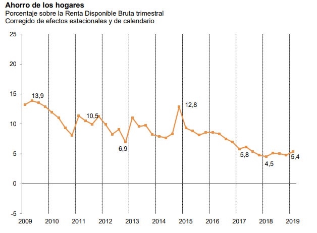 La tasa de ahorro de los hogares se situó en el 5,4% en el primer trimestre del ejercicio 2019, lo que significa un aumento de 6 décimas en relación al último trimestre de 2018, según los datos publicados por el INE, que ha dado a conocer las Cuentas Trimestrales no Financieras de los Sectores Institucionales. Si bien, esta tasa se ha calculado eliminando los efectos estacionales y de calendario. Si no se tuvieran en cuenta, los hogares registrarían un ahorro negativo del 4,5%.