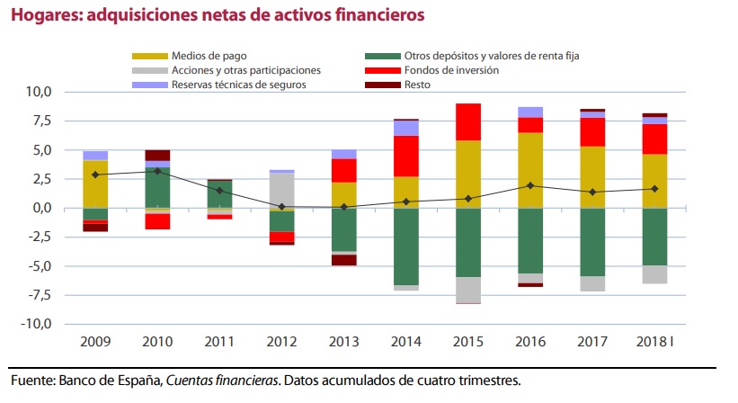 En cuanto a la riqueza de los hogares, ha seguido creciendo en gran medida por la revalorización de sus activos inmobiliarios. Las inversiones financieras netas se han situado en el 1,7% del PIB en el primer trimestre del año (1,4% en 2017).