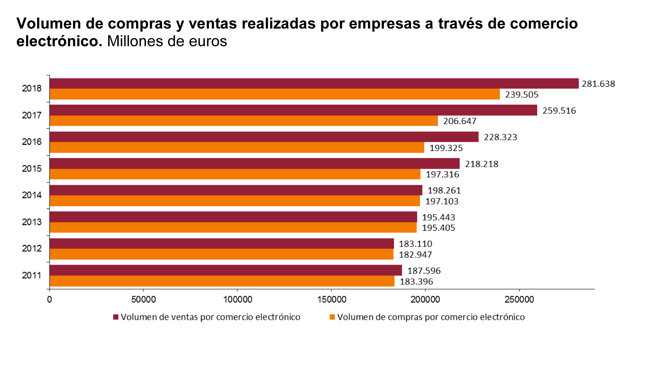 Las compras mediante comercio electrónico siguen al alza. El 33,9% de las empresas con 10 o más empleados realizaron compras mediante comercio electrónico en 2018. El volumen total de los pedidos de bienes y servicios fue de 239.505 millones de euros, con un aumento del 15,9%.