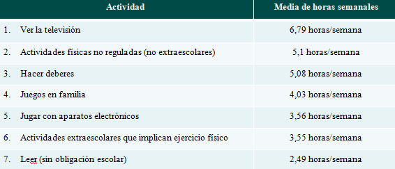 Caser ha publicado su II Estudio sobre Salud Familiar, titulado 'Alimentación y estilo de vida del niño del siglo XXI' y en el que se pone de manifiesto que los niños dedican la mayor parte de su tiempo de ocio a ver la televisión. En concreto, 6,79 horas semanales de media. A continuación, se sitúan la práctica de actividades físicas no extraescolares (5,1 horas/semana) y la realización de deberes escolares (5,08 horas/semana). "El tiempo que los niños españoles dedican a los deberes aumenta con la edad, llegando a ocupar un espacio realmente importante de su tiempo de ocio. Así, entre los 3 y 6 años le dedican 1,20 horas a la semana, tiempo que se incrementa hasta las 8,09 horas/semana entre los 11 y los 14 años", precisa José María Hernández, director médico de Caser.