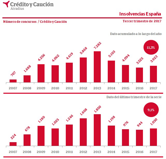 En el tercer trimestre de 2017 se han registrado cerca de 1.030 nuevos procesos concursales en España, según se desprende del seguimiento de las insolvencias judiciales que realiza el Área de Administración de Riesgos de Crédito y Caución, a partir de los datos publicados en el BOE. Frente a 2016, el dato trimestral representa un empeoramiento del 9,1% en los niveles de insolvencia judicial. El dato acumulado a lo largo de los 3 primeros trimestres del año supone un empeoramiento del 11,3% frente al mismo periodo del año anterior.