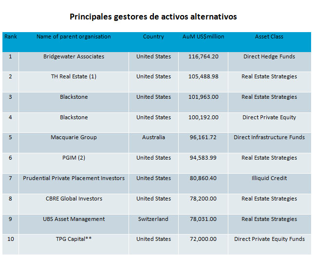 Este estudio aglutina las tendencias de inversión institucional a largo plazo de los 7 grupos principales de inversores a través de 10 clases de activos alternativos. Muestra que del centenar mejor, los fondos inmobiliarios tienen la mayor parte de los activos (35% y más de 1,4 billones de dólares), seguido de los fondos de capital riesgo (18% y 695.000 millones), los hedge funds (17% y 675.000 millones), los fondos de capital riesgo (12% y 492.000 millones), los fondos de crédito ilíquido (9% y 360.000 millones), los fondos de infraestructuras (4% y 161.000 millones) y, por último, las materias primas (1%).