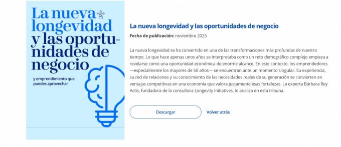 Instituto Santalucía, órgano de reflexión y debate del Grupo Santalucía, ha publicado su último estudio, titulado 'La nueva longevidad y las oportunidades de negocio y emprendimiento que puedes aprovechar' y firmado por Bárbara Rey Actis. Una de sus principales conclusiones es que la longevidad ya no puede abordarse únicamente como un reto demográfico, sino como una transformación profunda con implicaciones económicas, sociales y empresariales de gran alcance. Y se pone de relieve que el aumento de la esperanza de vida, el peso creciente de la población sénior y el desarrollo de nuevos ecosistemas de innovación vinculados a la longevidad abren oportunidades relevantes para emprendedores, empresas y territorios.