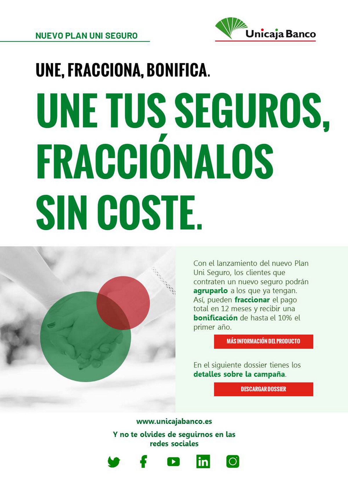 Unicaja Banco ha lanzado Plan Uni Seguro, un nuevo producto que permite agrupar en una única cuenta todas las primas y fraccionar mensualmente el pago de las mismas a coste cero. Esta iniciativa está abierta para un mínimo de 2 pólizas y deja financiar la prima sin intereses hasta en 12 mensualidades.
