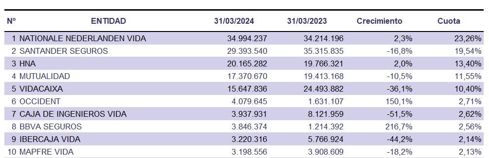 En los 10 primeros puestos de ranking, Mutualidad (4ª posición) experimenta un descenso de primas del 10,5%; VidaCaixa, en 5ª desciende un 36,1%; Caja de Ingenieros también pierde un 51,5% en primas; Ibercaja pierde un 44,2% y Mapfre Vida un 18,2%.