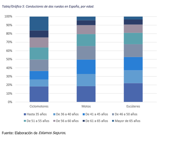 Vázquez llamó la atención sobre la edad de los que utilizan este medio de transporte puesto que "se piensa que es jóvenes, pero su influencia afecta al 20%" de ese ámbito de edad. Los ciclomotores son utilizados principalmente por mayores de 65 años, especialmente por personas que lo utilizan para desplazarse en zonas menos habitadas y como medio de transporte para desplazarse a realizar labores agrícolas. La edad más predominante en el uso de las motos es entre los 40 y los 55 años, mientras que en los escúteres sí haya una fuerte penetración en jóvenes de hasta 35 años y de ahí hasta los 65 años.