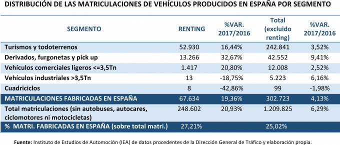 La Asociación Española de Renting de Vehículos (AER) ha publicado los datos relativos a la procedencia de fabricación de los vehículos de renting matriculados en España durante el pasado año. Las matriculaciones de vehículos en renting producidos en España aumentaron un 19,36% en 2017: el 27,21% de las unidades matriculadas en renting salieron de alguna de las 17 factorías situadas en España. En total, los vehículos producidos en España matriculados en renting fueron 67.634.