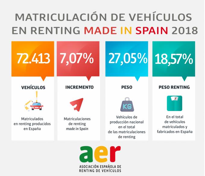 Los vehículos producidos en alguna de las 17 factorías situadas en España han sido los que han tenido más peso en las matriculaciones de renting durante 2018, según datos facilitados por la AER. Un total de 72.413 unidades matriculadas por el renting ha salido de alguna factoría española, lo que supone el 27,05% de las matriculaciones de renting. Este dato supone un aumento del 7,07% respecto al año anterior.