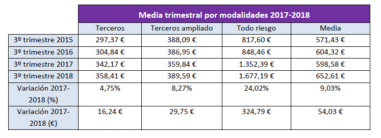 La modalidad de seguros a todo riesgo ha sido la que más ha aumentado su precio con respecto al tercer trimestre del año anterior, con un aumento del 24,02%. Los seguros a terceros ampliados registraron un incremento del precio del 8,27%, y los seguros a terceros básicos del 4,75%.