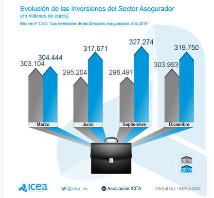 Los datos de ICEA muestran que el volumen estimado del total de las inversiones del sector asegurador español en el cuarto trimestre de 2019 se situó en 319.750 millones de euros. De esa cifra, el 55% representa la inversión de la cartera de Vida, el 12,7% la de No Vida, el 28,5% la cartera general y los fondos propios suponen el 3,8% restante.