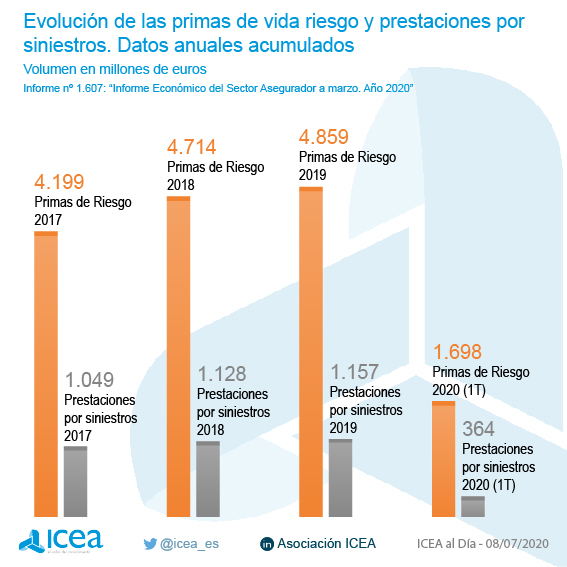 Las primas de seguros de Vida Riesgo se elevaron al cierre de marzo a 1.698 millones de euros, lo que equivale a un crecimiento del 6,66% sobre el mismo mes del año anterior. Los datos de ICEA sitúan la cifra de asegurados en 20.618.674, un 0,96% menos.