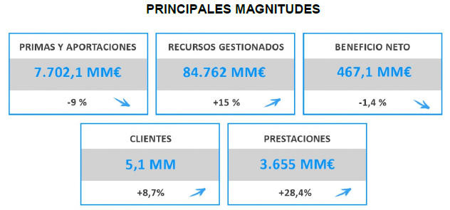 El volumen de recursos gestionados ascendió a 84.762 millones de euros, un 15% más. De éstos, 54.368,4 millones corresponden a seguros de Vida. El resto, 30.393 millones, corresponden a Planes de Pensiones y EPSV, con un crecimiento del 4%.