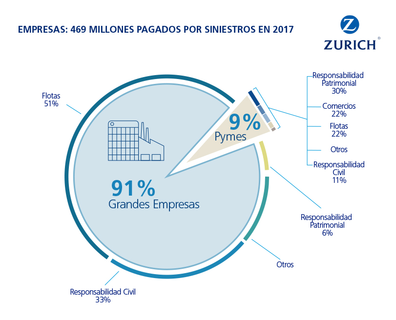 Zurich Seguros abonó en 2017 cerca de 469 millones de euros en concepto de indemnizaciones por los siniestros sufridos por los clientes de su división Zurich Empresas. Los siniestros relacionados con las flotas de vehículos y la RC fueron los más habituales. Según los datos difundidos por la aseguradora, el número de siniestros declarados por los clientes de empresas de Zurich en 2017 se redujo un 9% respecto a 2016, aunque el volumen de las indemnizaciones abonadas se incrementó en un 33% en comparación con el periodo anterior.