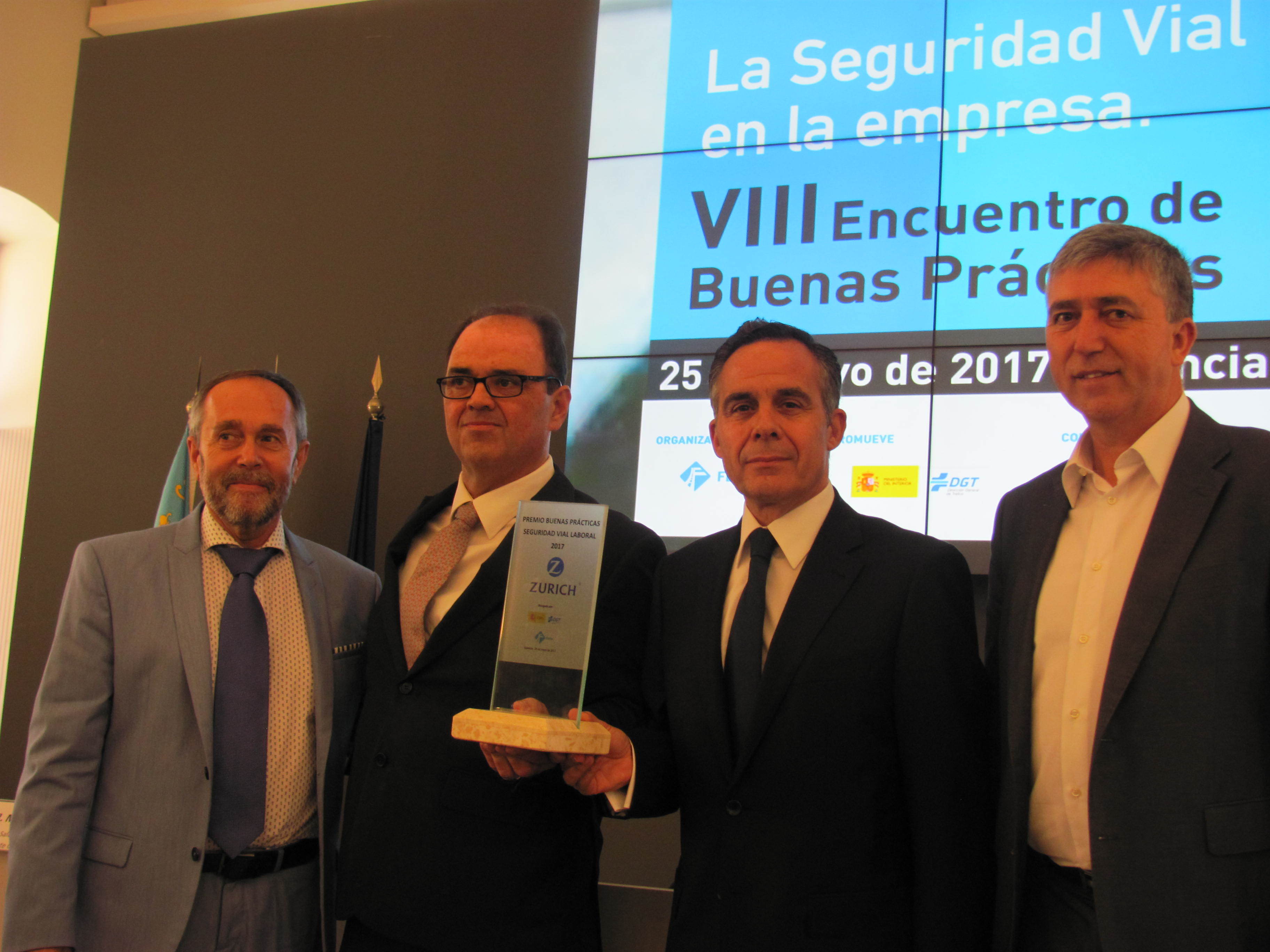 Zurich Seguros ha sido premiada “por su labor en la gestión de riesgos relacionados con la seguridad vial en entornos empresariales” durante la celebración del VIII Encuentro de Buenas Prácticas, que ha tenido lugar en Valencia. El galardón lo han entregado conjuntamente el Instituto Nacional de Seguridad e Higiene en el Trabajo (INSHT), la DGT y Fesvial; y lo ha recogido Julio Moreno, responsable para Flotas y Transporte de Empresas de Zurich Seguros.