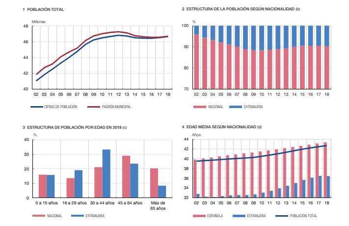 De acuerdo con la última información de Cifras de Población, publicada en diciembre de 2018 por el INE, se estima que la población española se situó, el 1 de julio del pasado año, en 46.733.038 personas. Esta cifra supone un incremento interanual de unas 200.000 personas (0,4%), que prolonga el perfil de suave recuperación mantenido tras la crisis, según destaca el Banco de España en el informe Evolución reciente y proyecciones de la población en España.