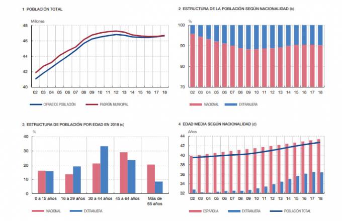 El proceso de envejecimiento de la población continúa caracterizando al colectivo de nacionales, cuya edad media prolongó su perfil creciente hasta alcanzar los 43,4 años. Por el contrario, entre la población inmigrante, la edad media parece haber interrumpido la senda ascendente de los últimos años (36,4 años de edad media en 2018).